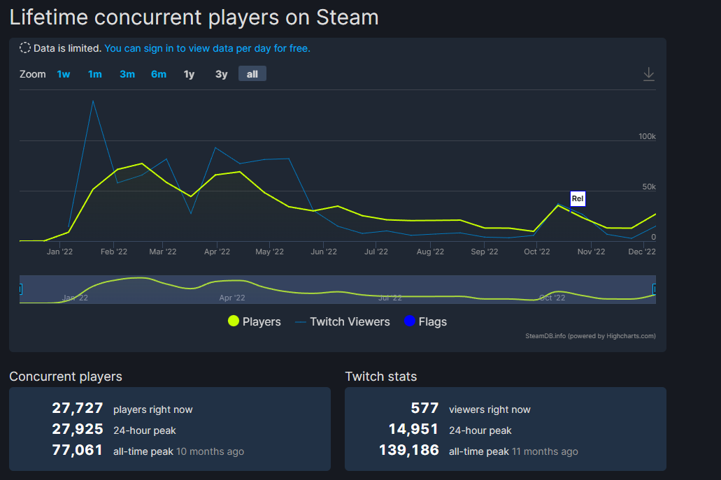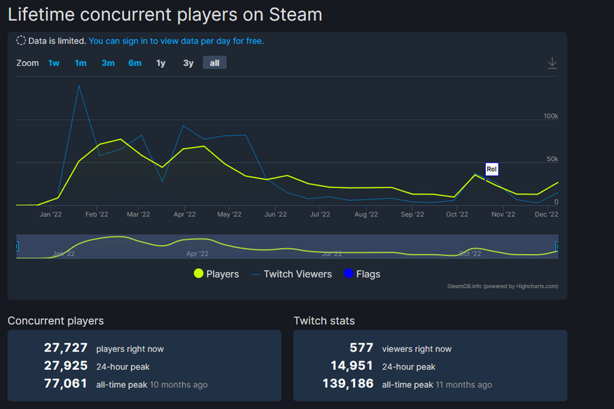 Когда Vampire Survivors (далее VS) вышла в раннем доступе, только ленивый не сравнил ее с Crimsonland, Alien Shooter, и прочими пострелушками с видом "сверху". Жанр это не новый, и начало берет как минимум в 1990 с игры Super Smash TV, а как максимум в 1962 с легендарной Spacewars!, разработанной для похожего на радар подводной лодки компьютера PDP-1. Поэтому интереса поначалу к игре особого не было. Это легко можно отследить по графикам SteamDB. В первый месяц запуска в раннем доступе(декабрь 2021) в VS почти никто не играл. Только к концу января 2022 количество игроков начало стремительно расти.