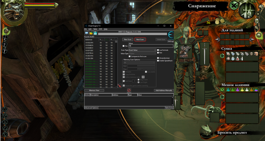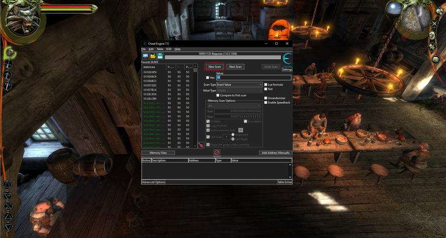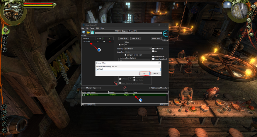 6. Возвращаемся в игру и любым доступным способом изменяем количество золота. В окне Cheat Engine вводим новые данные в поле Value и нажимаем на Next Scan. Щёлкнув левым кликом мыши по найденному значению, изменяем количество золота.
