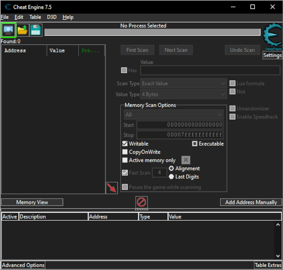 3. Запускаем Cheat Engine от имени администратора. Если всё прошло успешно, то перед вашим взором появится окно программы.