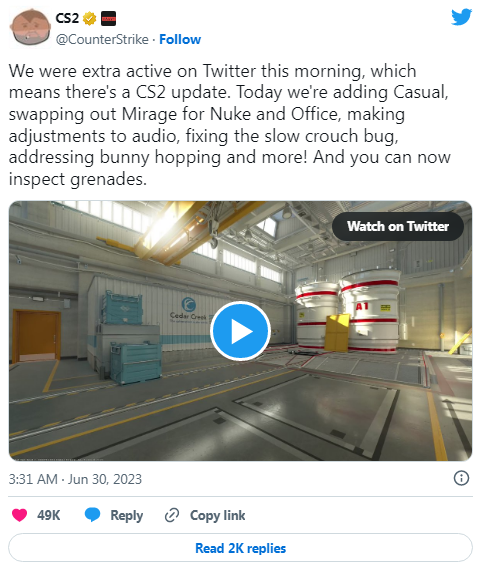 Помимо тестирования своих новых версий классики, Valve также открыла казуальный плейлист (и в этом режиме можно получить доступ к версии Office CS2) и поработала над звуком. Последнее обновление добавляет эффекты расстояния ко всем позиционным источникам звука, устраняет несколько звуковых ошибок и добавляет «уникальный слой звуковой окклюзии, помогающий с вертикальным позиционированием звука в Nuke».