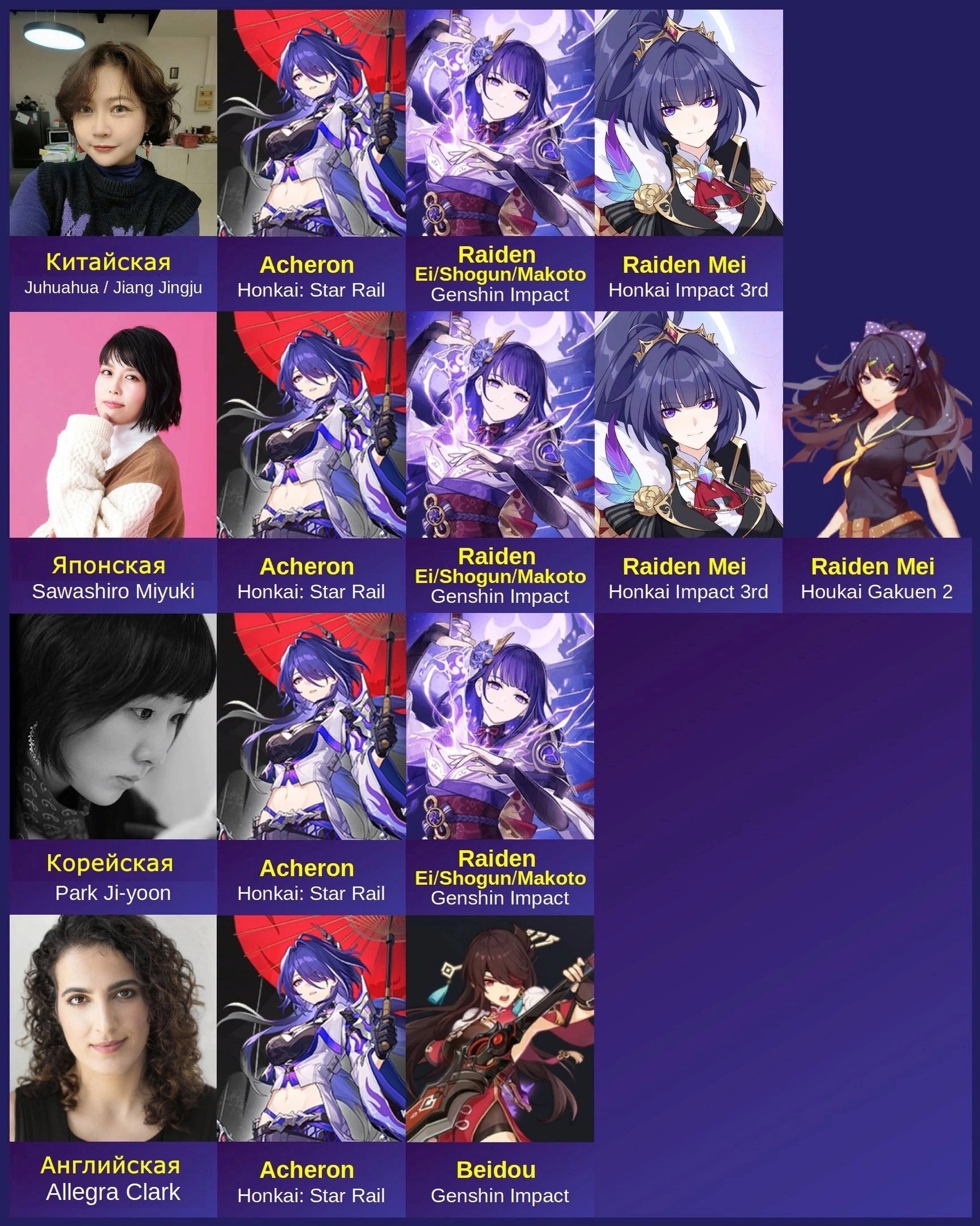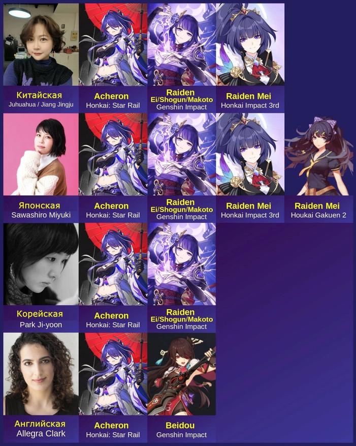 Весомым аргументом являются одни и те же сэйю (актрисы озвучки) для Ахерон, Сёгун Райден и Райден Мэй, а в японской локализации сэйю озвучивает потенциально все 4 версии Райден, существующие в мультивселенной Hoyoverse. Сравнение актеров озвучки у похожих персонажей из разных игр компании стало уже традицией. Так сообщество ищет связи между персонажами различных проектов компании и в большинстве случаев это работает безотказно.