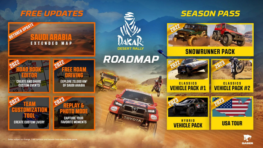 Еще на первом этапе в игре будет сразу доступны, пять платных обновлений, в рамках которых игрок сможет получать доступ к новым автомобилям картам и раллийным событиям. Однако, как и говорилось ранее, в игре будут и бесплатные обновления и дополнения, одним из таких станет Saudi Arabia Extended Map. Это дополнение будет доступно в недалеком будущем, после релиза игры в его рамках игрок получит доступ к воссозданным событиям реального ралли «Дакар» 2020-2022 годов.