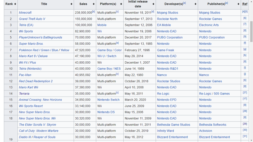 А что если мы вычеркнем игры от Nintendo, которые занимают добрую половину списка? А ещё игры с элементами мультиплеера вынести за скобки… И что же выходит? С девятнадцатой строчки Skyrimподнимается на первую, что делает её самой продаваемой синглплеерной западной игрой. Внимательный читатель может поспорить, заметив что Witcher 3 точно так же изначально расположен на 19 месте. Но позиция «Ведьмака» в списке обусловлена информацией датированной июлем 2021 года, а 30 миллионов Skyrim посчитали и добавили в таблицу аж в апреле 2017 года, с тех пор Bethesda точно прибавила к этой цифре.