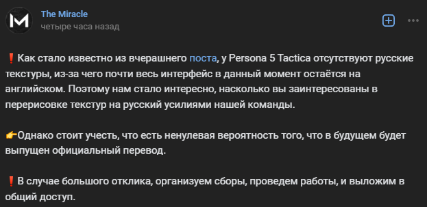 Команда переводчиков The Miracle обнаружила в файлах игры Persona 5 Tactica текстовую локализацию на русский язык. Правда, перевод оказался незаконченным. Локализации подверглись только диалоговые окна и прочий текст, который который можно было отредактировать в самом коде игры. Но в игре остаётся немало текста, который вмонтирован во внутриигровые арты и прочие текстуры и не поддаётся простому переводу через переписывание кода.