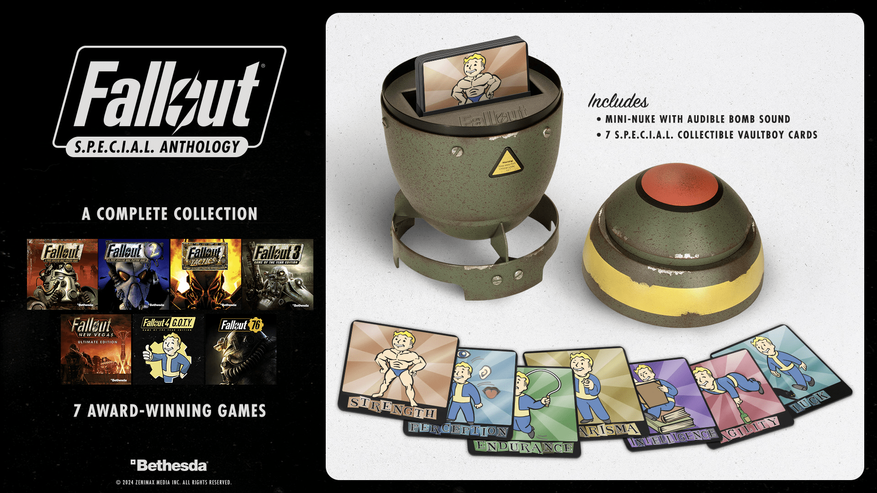 Студия Bethesda Softworks анонсировала новое физическое издание Fallout S.P.E.C.I.A.L. Anthology, выполненная в характерной форме атомной боеголовки, используемой в поздних частях серии Fallout. Помимо снаряда, внутри него будут храниться карточки S.P.E.C.I.A.L., на каждой из которых будет указан ключ к одной из семи игр из серии Fallout.