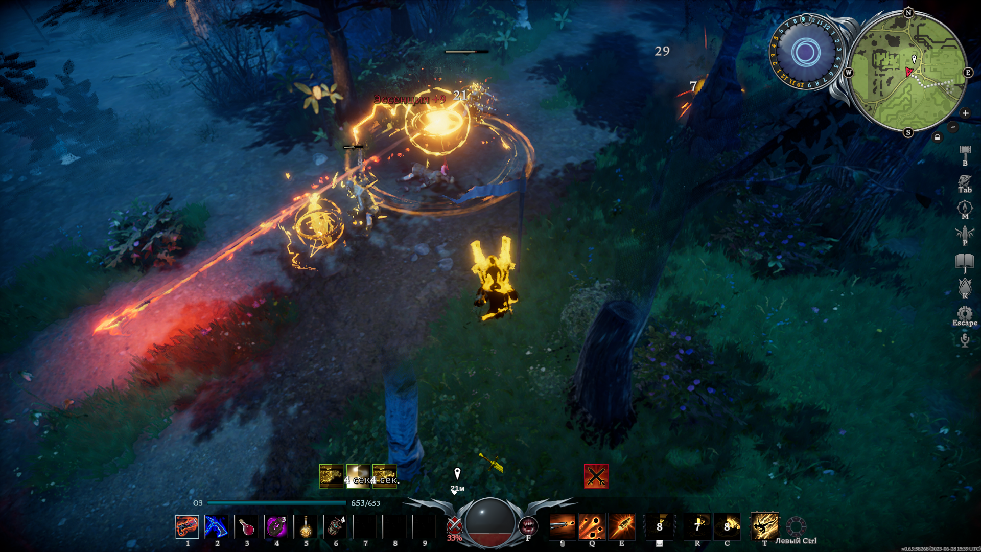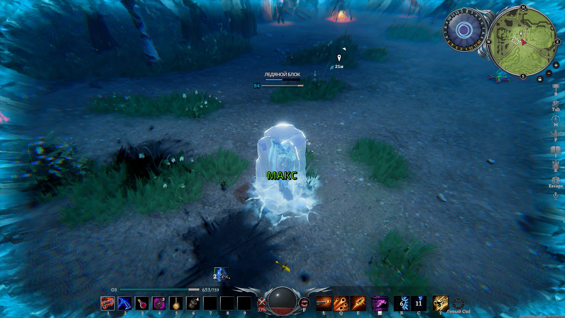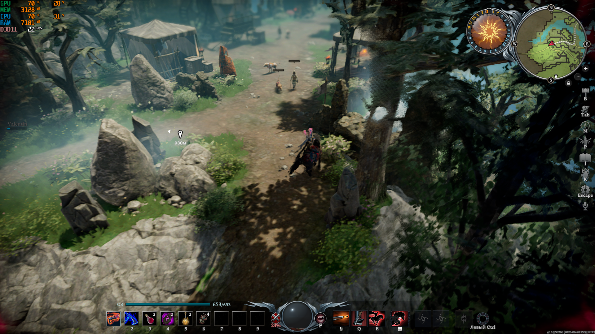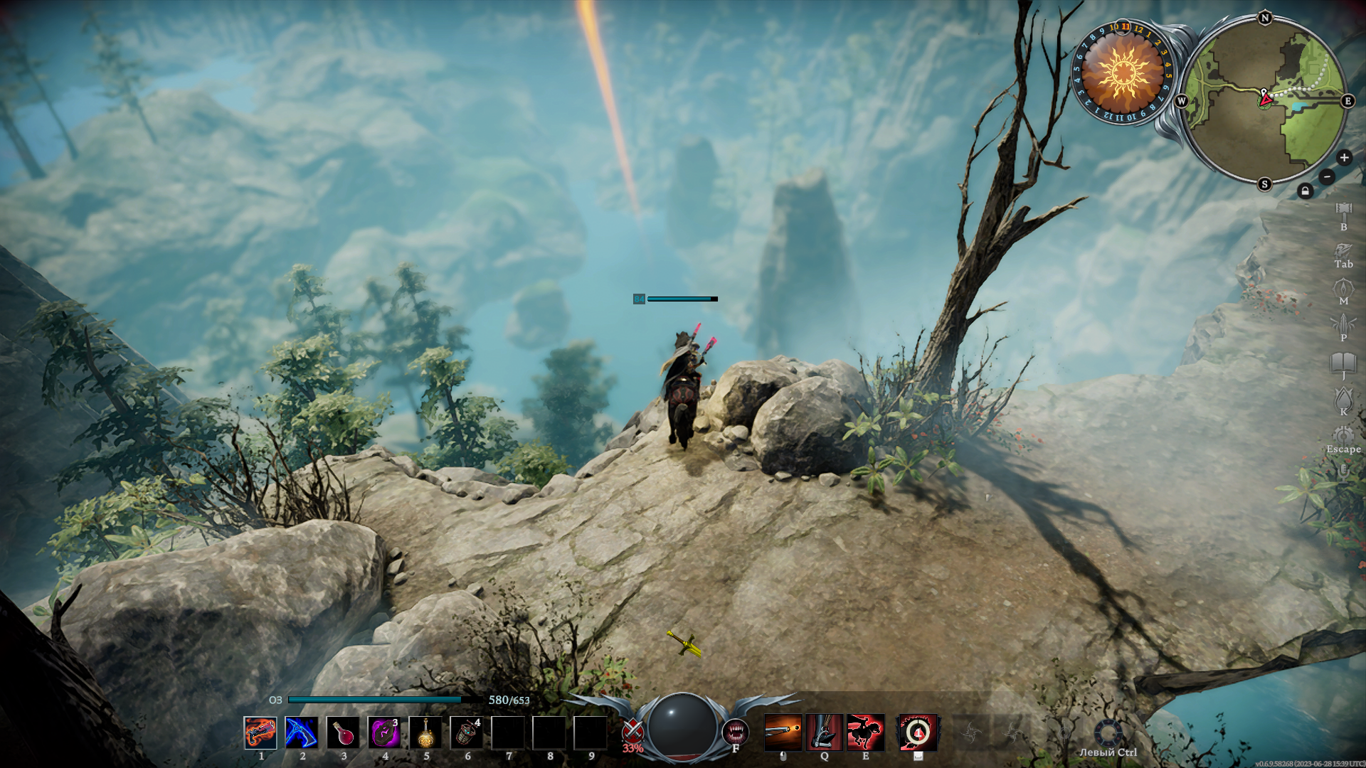 Из оружия мы можем скрафтить обычный меч и двуручный, копье, топоры, булаву, арбалет, пистолеты, косу и клинки. Каждое оружие уникально и открывает большое поле для экспериментов. Обычный меч является неплохим оружием, но он явно сильнее проявляет себя в PvP, чем в PvE. Двуручный меч хорош засчет классных спеллов на маневренность — здесь и рывок на Q, и прыжок, дающий неуязвимость, на E. Копье очень мощное оружие для ближнего боя, позволяющее наносить тонны дамага, держать в контроле и притягивать врага.