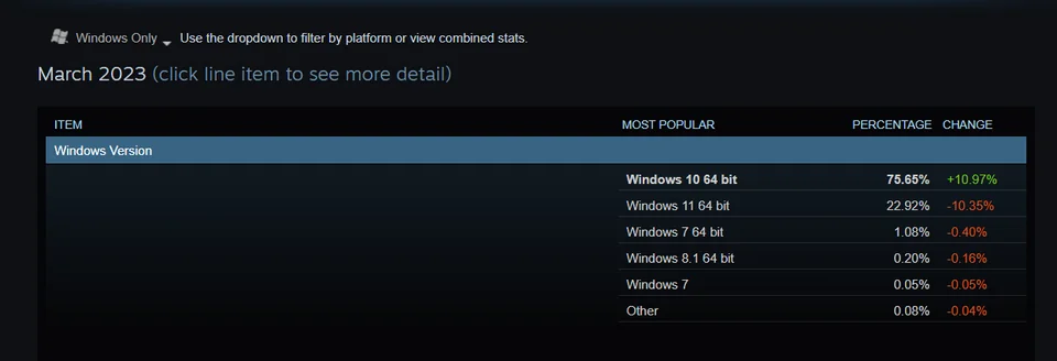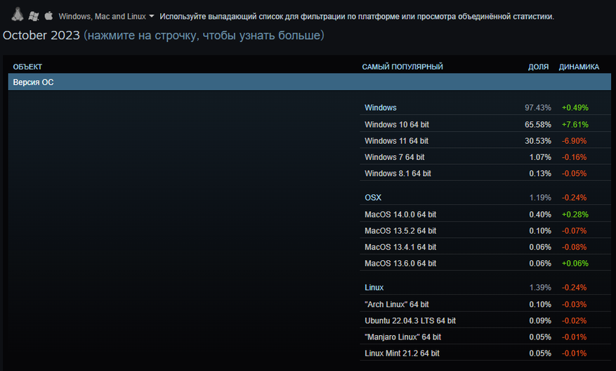 С момента объявления этой новости прошло уже более 7 месяцев. Если верить официальной статистике, которую Valve публикует каждый месяц, то за это время большинство пользователей Steam пользуются 10-й и 11-й версией Windows. При этом, за октябрь доля пользователей Windows 11 упала на 6,9%, а доля пользователей Windows 7 всё ещё находится на третьем месте и составляет 1,07%. За этот период доля упала лишь на 0,01%.