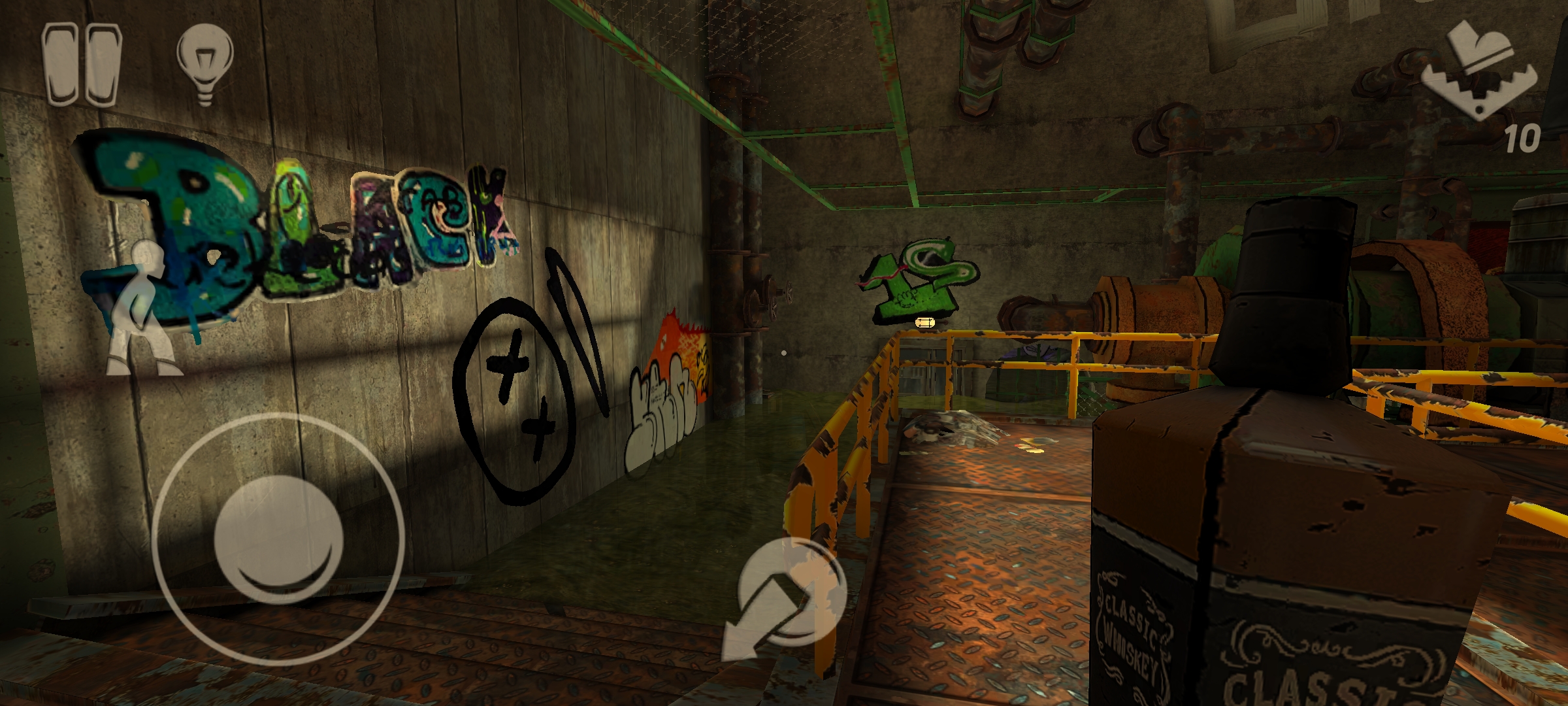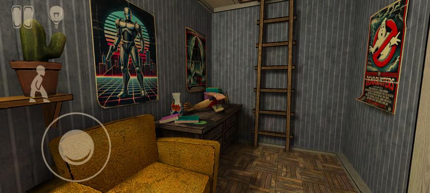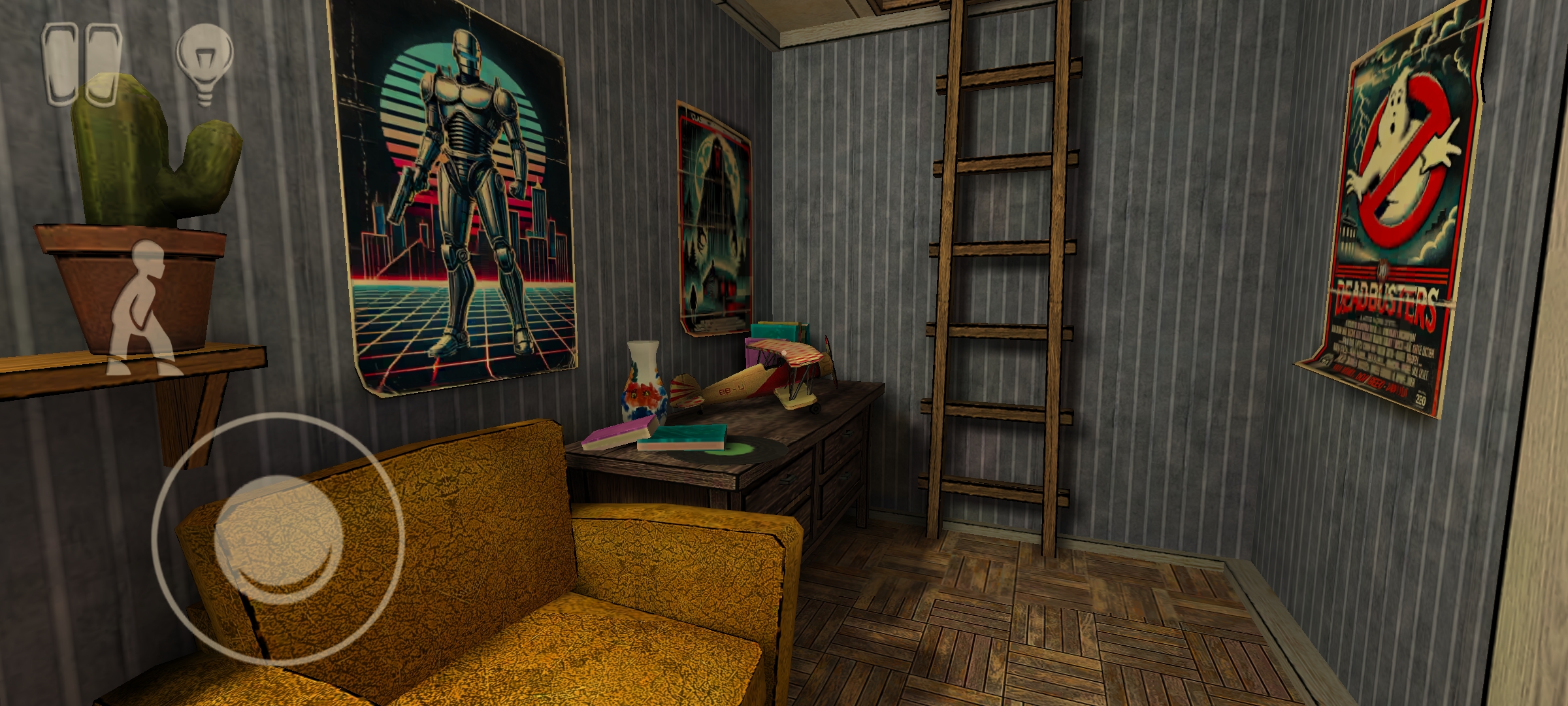 Управление удобное и отзывчивое. Кнопки большие, но не застилают экран. Можно настроить их прозрачность и чувствительность сенсорных стиков. Меня устроили предустановленные настройки. Персонаж движется быстро, в едином темпе, и всегда может обогнать преследователя. Даже вприсядку скорость приемлемая. Игра не превращается ни в вязкий, скучный симулятор ходьбы, ни в нелепый двуногий Need for Speed. Ты успеваешь видеть локацию и не утыкаешься на скорости в предметы окружения. Тут есть чёткое ощущение контроля над персонажем и ситуацией, что очень важно в играх подобного жанра, но часто не реализуется должным образом в играх. На всех уровня сложности, кроме «Призрака», нам необходимо перемещаться по локациям быстро, не тормозить, в тоже время, не упуская из виду важные объекты, предметы, участки и нашего преследователя. Грамотно настроенное разработчиком управление нам это позволяет.