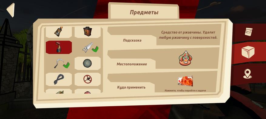 В игре на локациях можно найти десятки предметов. Взять одновременно в руки нам позволено только один, если за реальные деньги не куплен рюкзак. Поделить предметы (классифицировать) можно на квестовые и метательные объекты для временного оглушения врага. Квестовые предметы также делятся на «ключи» от «дверей», чертежи и ресурсы для сборки по чертежам. Чертежи и ресурсы для сборки необходимо нести к верстаку в самой первой локации. Квестовые предметы-«ключи» надо доставить и активировать у соответствующей «двери». Дверь и ключ всегда расположены на разных локациях. В корзину велосипеда можно загрузить одновременно три предмета, чтобы перевезти их с одной локации на другую. Меню подсказок укажет, где искать предмет и куда его применить. Вся игра — это поиск предметов и беготня с ними туда-сюда. Потерянный либо выброшенный предмет сохраняется там, где мы его оставили, что удобно.