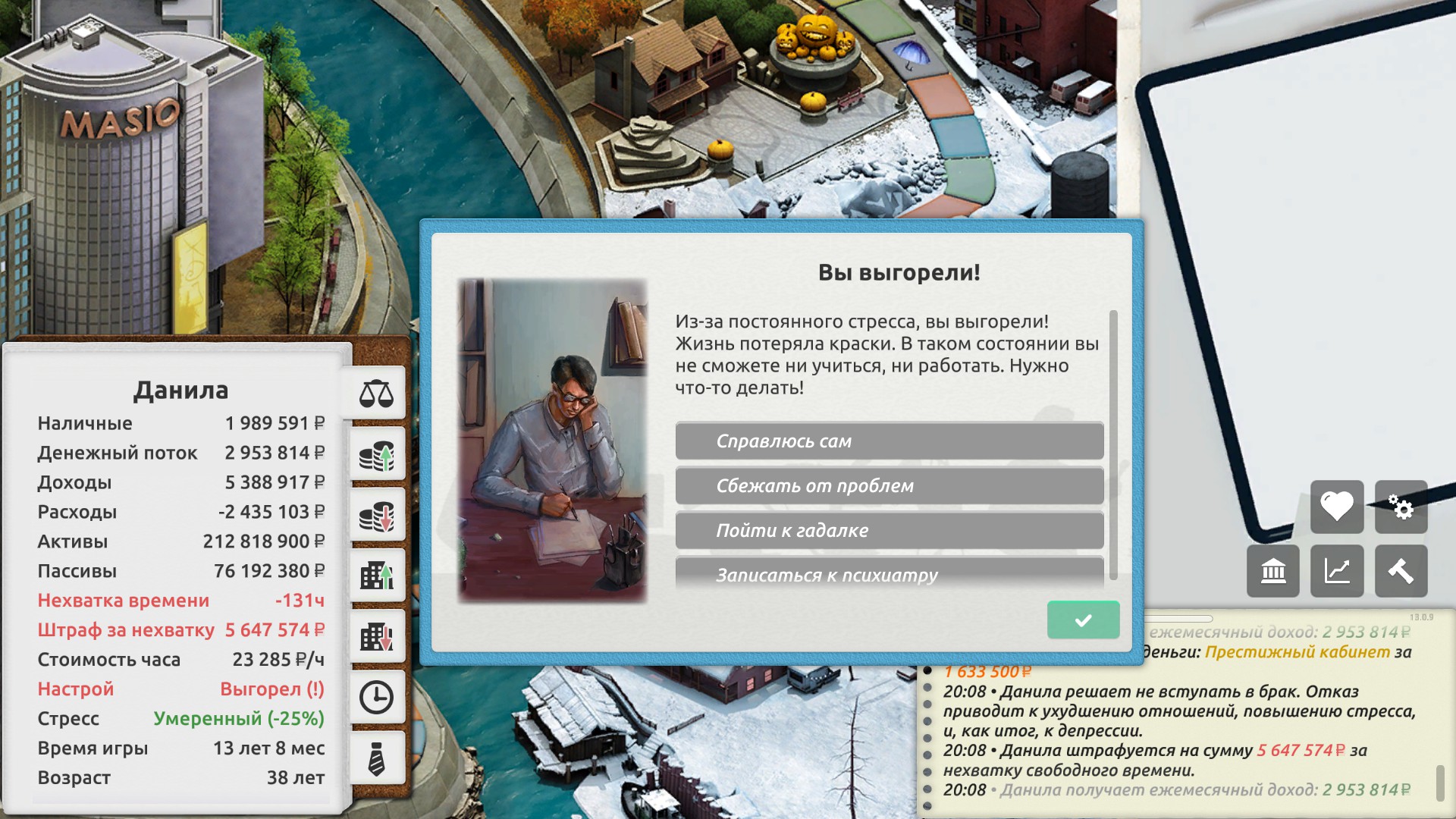 Ваш персонаж то и дело будет тратить деньги на бесполезные вещи, а если вы откажетесь покупать их, его настроение будет падать. Всё это в конечном счёте приведёт к выгоранию, герой начнёт терять деньги, впадёт депрессию, что может сделать его банкротом. Также в процессе игры персонаж может заболеть, это тоже скажется на его эмоциональном состоянии и желании работать.