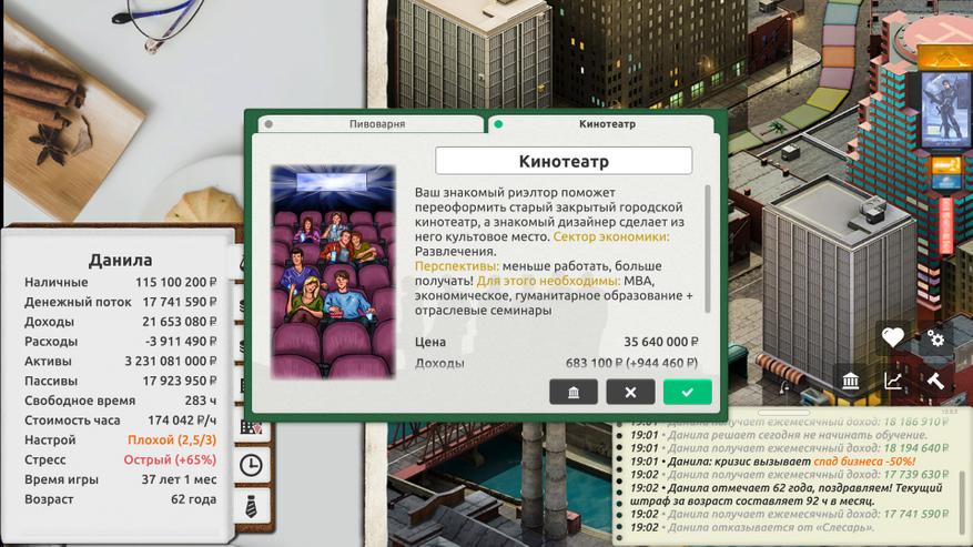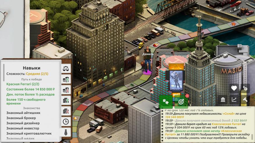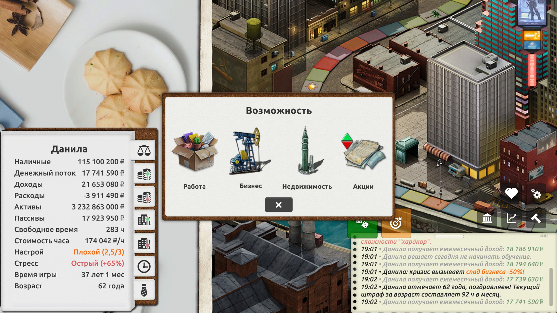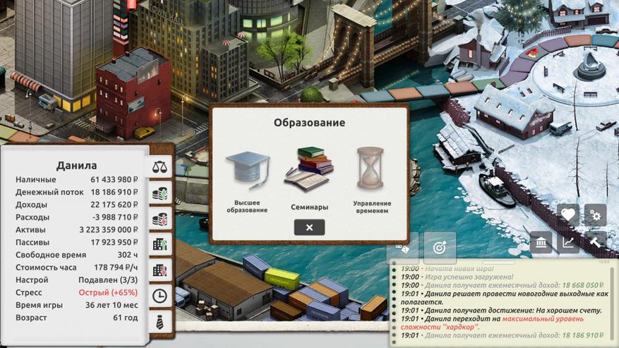 Попутно необходимо повышать уровень образования персонажа. Чем он умнее, тем лучше и качественнее работает, лучше оптимизирует бизнес или налаживает контакты с полезными людьми. Отдельное внимание необходимо уделять свободному времени, которое имеет каждый персонаж. Количество свободных часов зависит от возраста героя: чем он старше, тем меньше времени у него есть. А чем меньше времени, тем меньше он сможет работать. Поэтому во время игры необходимо также развивать навыки по планированию времени.