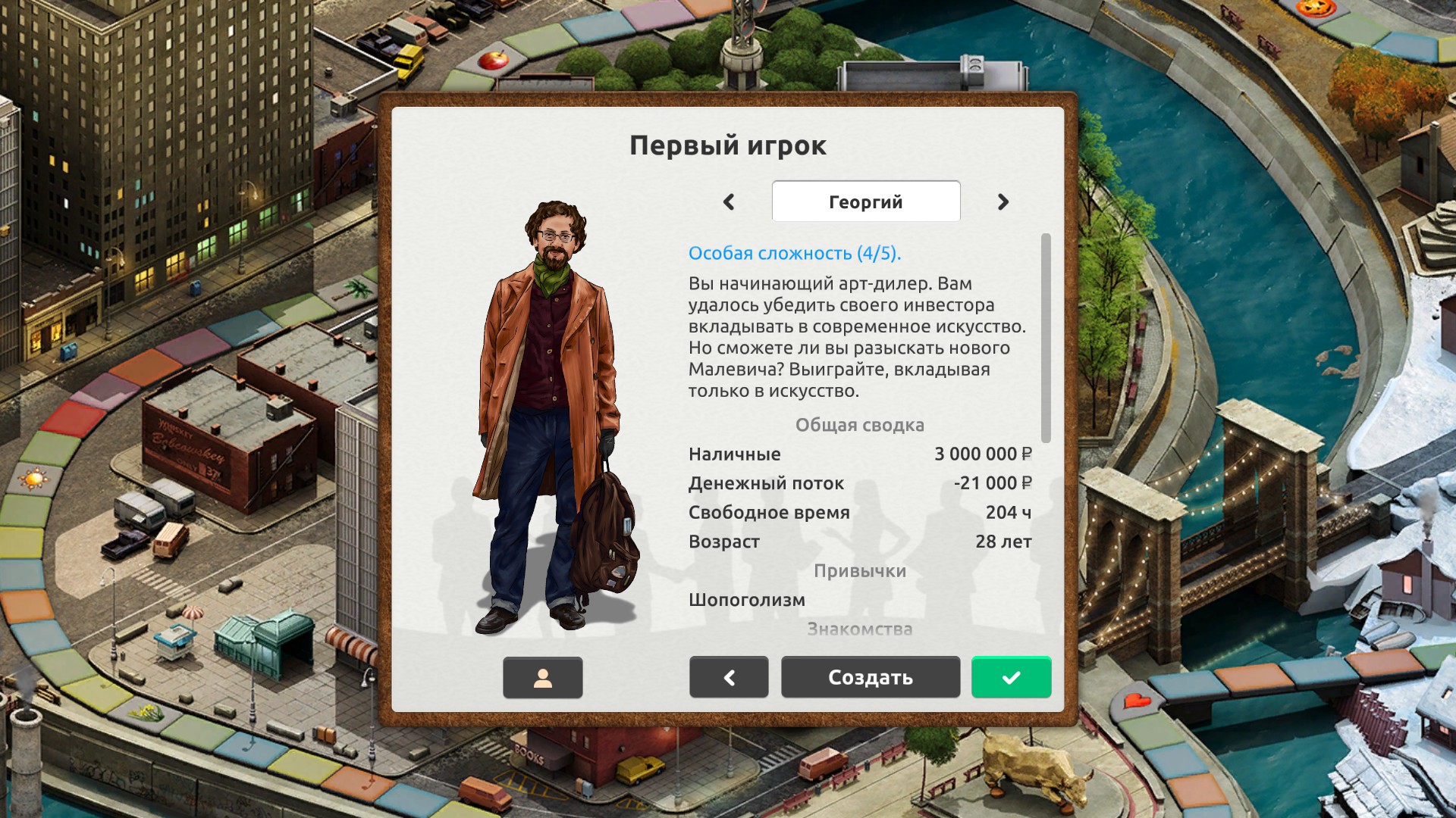 Перед началом игры необходимо выбрать персонажа. В игре их несколько, у каждого из них будет своя цель, необходимая для победы, а также стартовые накопления и вредные привычки. На каждом уровне сложности нужно накопить разную сумму денег. Как было отмечено выше, сделать это можно несколько способами: устроиться на работу, открыть бизнес, купить недвижимость или вложиться в акции какой-либо компании.