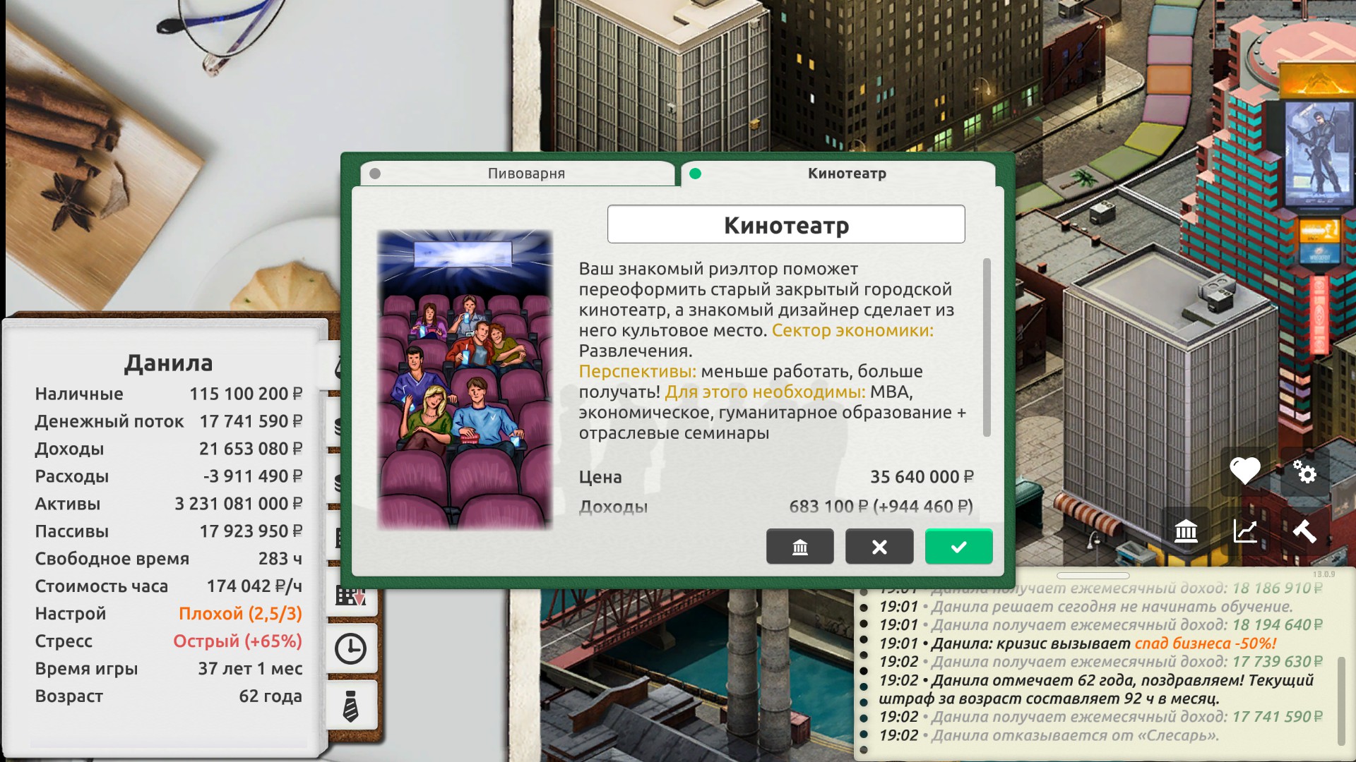 Во время игры на рынке может произойти и кризис, что серьёзно ударит по бизнесу. Продавать все активы и недвижимость, пока они совсем не упали в цене или работать в убыток? Решать только вам, и только от вас будет зависеть судьба героя.