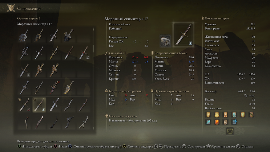 Если хочется элегантно и изящно бить врагов, то можно взять в руки 2 одинаковых вида оружия. Я взял 2 скимитара. Выглядит красиво, атаки быстрые. Наложите на оба оружия разные эффекты. Один, скимитар, у меня морозит противника, другой - пускает кровь. Очень круто бьёт большинство видов врагов, особенно рядовых.