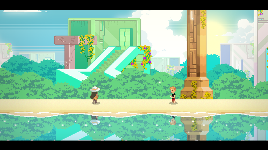 Несмотря на то, что события происходят на небольшом острове, здесь есть чем полюбоваться. Рисовка очень приятная, палитра цветов яркая и сочная, а пейзажи постоянно меняются. Встречает нас солнечный пляж и зеленые джунгли, которые затем сменяются руинами древнего города, садами и алым цветочным полем. Художникам удалось создать визуальный стиль, который отлично дополняет расслабляющий игровой процесс.