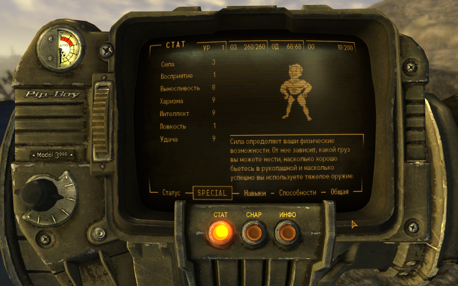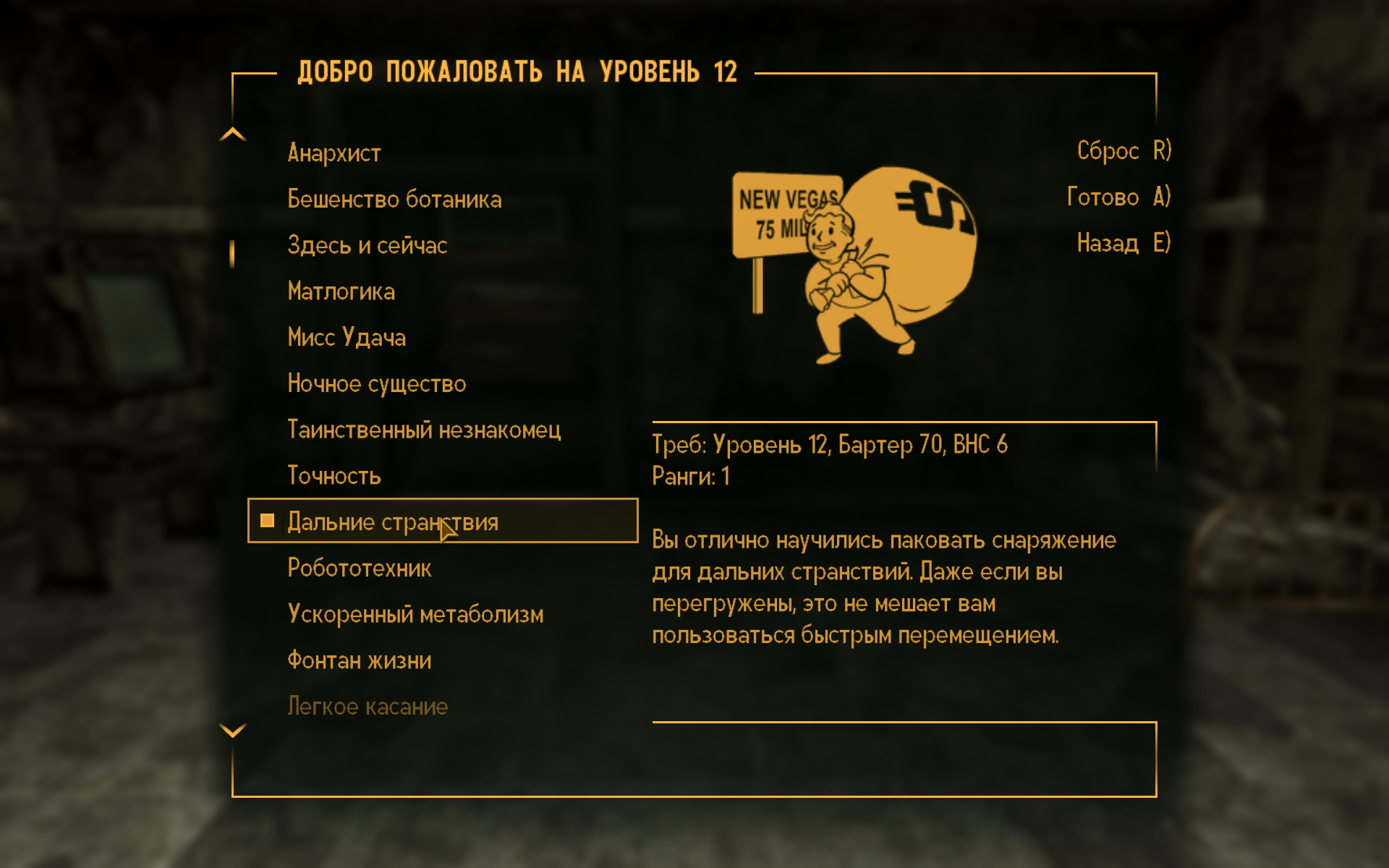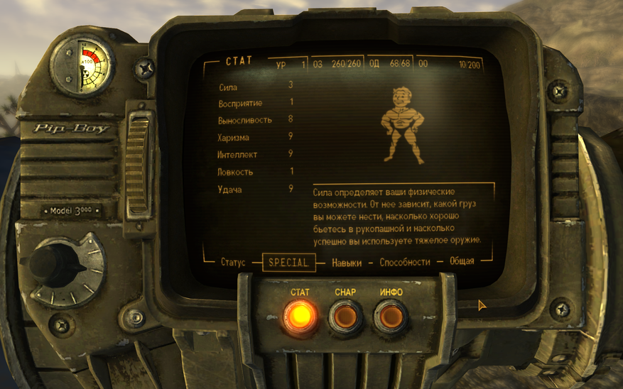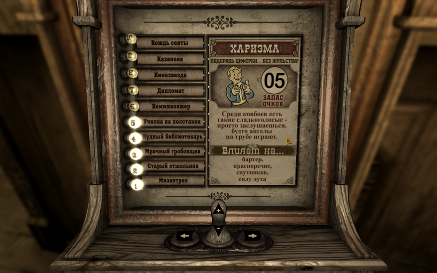 Решил развеять миф о бесполезной «харизме». Создал персонажа с 9 «харизмы» и 9 «интеллекта». «Ловкость» и «восприятие» по 1. Остальные очки вложил в «выносливость» и «удачу». «Силу» сделал 3. Взял особенность «добрая душа», выбрал «красноречие», «бартер» и «науку» в качестве основных навыков. К тому же начал игру в режиме «хардкор». А ещё принял волевое решение — не повышать боевые навыки и брать только мирные перки. Играл правда на нормальной сложности.