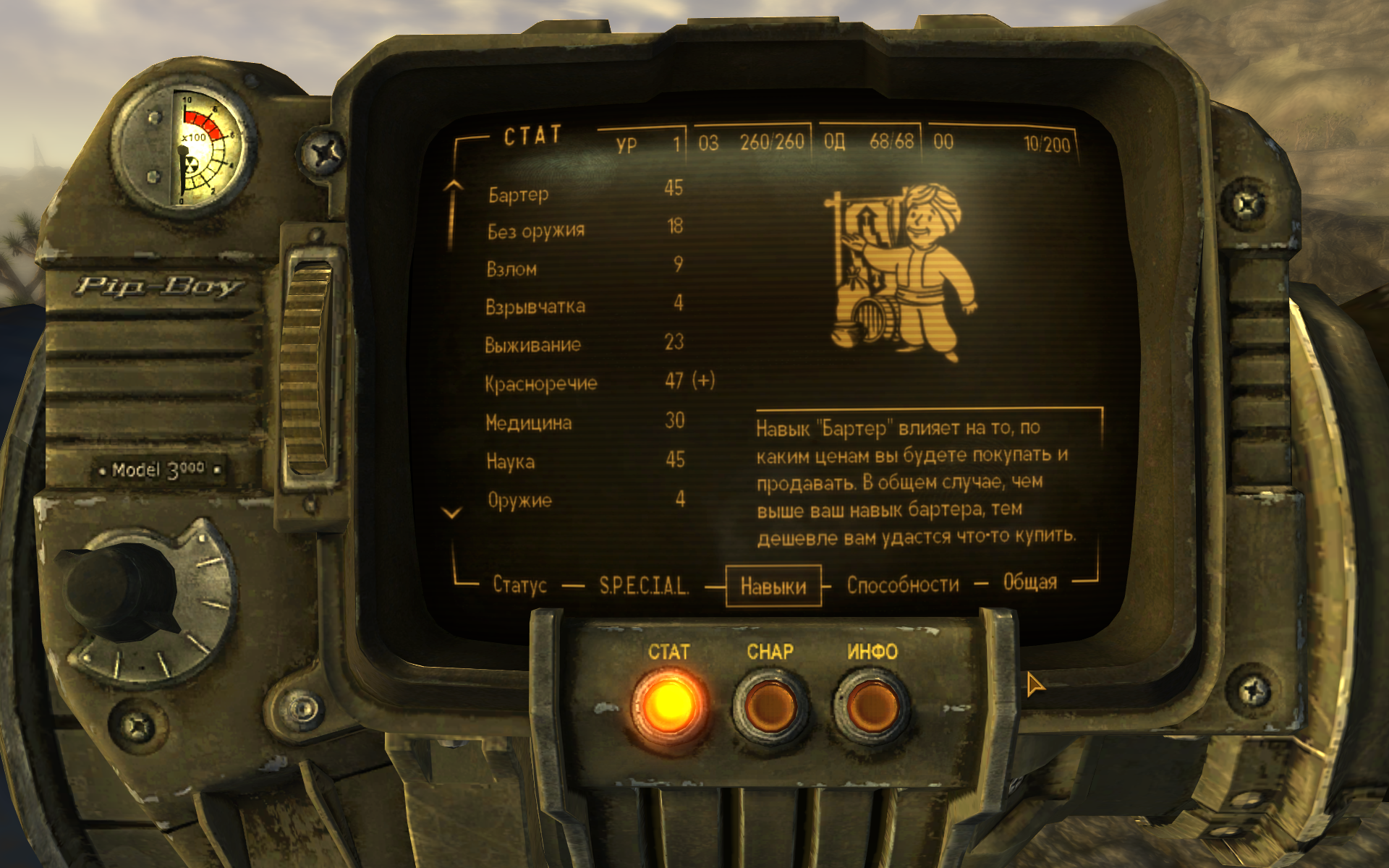 Первым делом надо дойти до Примма и починить Эд-Э. Если просто идти по сюжету, то проблем вообще не возникает. По пути ещё можно взять снайпера Буна или Веронику. Можно ещё заглянуть к Бомбистам, и раздобыть для Вероники силовую броню Братства Стали. Ну так вот, Вероника и Эд-Э легко расправлялись с любыми противниками, встреченными на пути, а Курьер стоял рядышком и делал вид, что стреляет из 9 мм пистолета. При этом я повышал в основном «красноречие», «бартер» и «науку». Квесты проходил исключительно силой убеждения. Наверное, ещё стоит вложиться в «медицину», «выживание», «скрытность» и «взлом». В принципе, с таким набором навыков можно пройти любой квест и основной сюжет. Напарники же завалят кого надо. Так что «харизма» тут вовсе не бесполезна. С её помощью можно с самого начала игры получить очень высокие значения «красноречия» и «бартера», что очень упрощает прохождение. И это вполне рабочий стиль игры, как и в Fallout 2, например. Кстати, даже «ремонт» можно особо не качать.