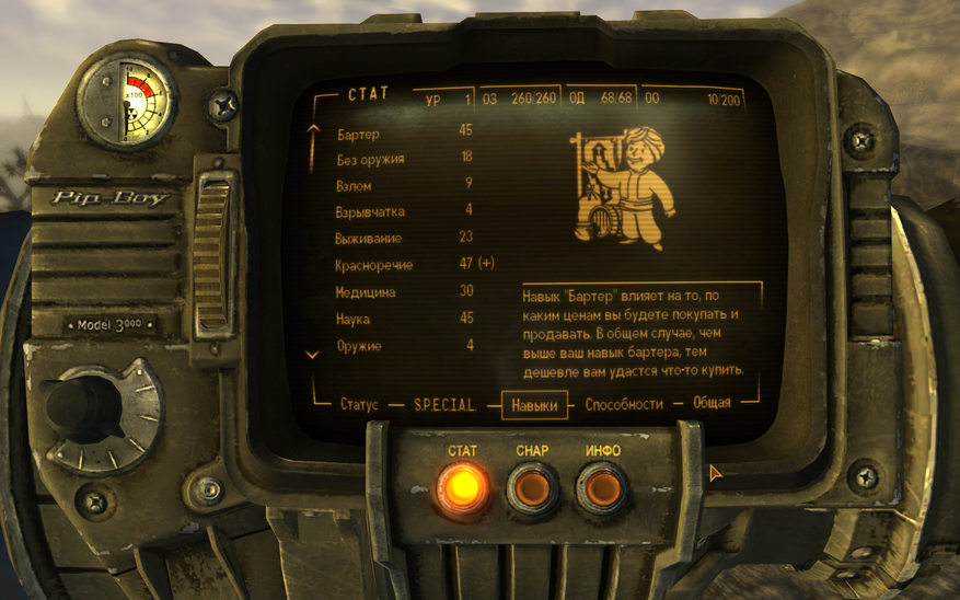 Тут ещё навык «взрывчатка» отвечает за стрельбу из гранатомёта. В общем, всё равно намудрили. Разделение на огнестрельное и энергетическое оружие то вполне уместно. Хотя, «бартер» и «красноречие» вполне логично разделены. Их точно не надо объединять, а то получился бы слишком уж крутой навык. Правда в некоторых диалогах всё равно можно торговаться при помощи «красноречия». В любом случае, где-то к 20 уровню можно иметь около максимальные значения одного оружейного навыка, «ремонта», «науки» и «красноречия». Можно и раньше. Всё зависит от начальных параметров и способностей.