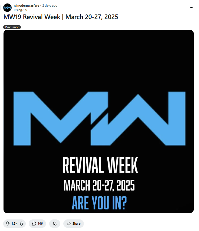 Организатор события, пользователь Reddit под ником Rising709, поделился идеей «недели возрождения» в сабреддите Modern Warfare. Он предложил всем желающим загрузить игру и провести несколько дней, ностальгируя по её многопользовательскому режиму. Мероприятие не привязано к конкретному региону или платформе, что даёт шанс собрать достаточно большую аудиторию для возрождения активных матчей.