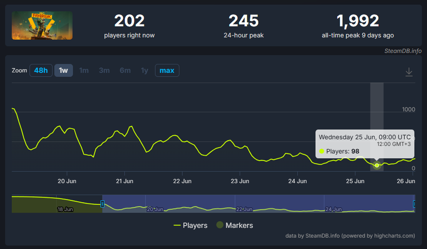 Мультиплеерный шутер FBC Firebreak, некогда подававший надежды в нише кооперативных PvE-игр, столкнулся с резким падением интереса со стороны игроков. На своём пике игра привлекала до 2000 активных пользователей, однако за 25 июня был зафиксирован самый низкий показатель онлайна, который снизился от пиковых значений на 95% и составлял в моменте 98 человек.