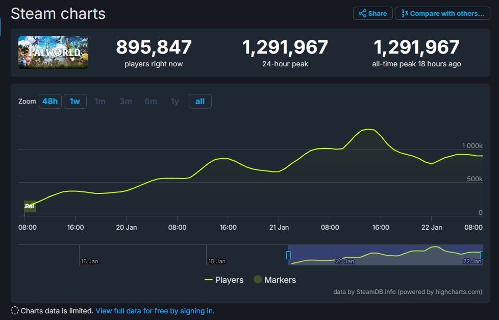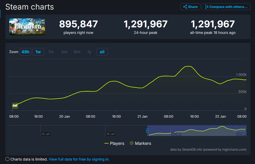 Новая игра про покемонов с пушками метеором ворвалась в топ продаж и одновременного онлайна Steam. Несмотря на слабую визуальную составляющую, некоторые баги и общую «дешевизну» проекта продажи Palworld за три дня после релиза превысили четыре миллиона копий. ъ