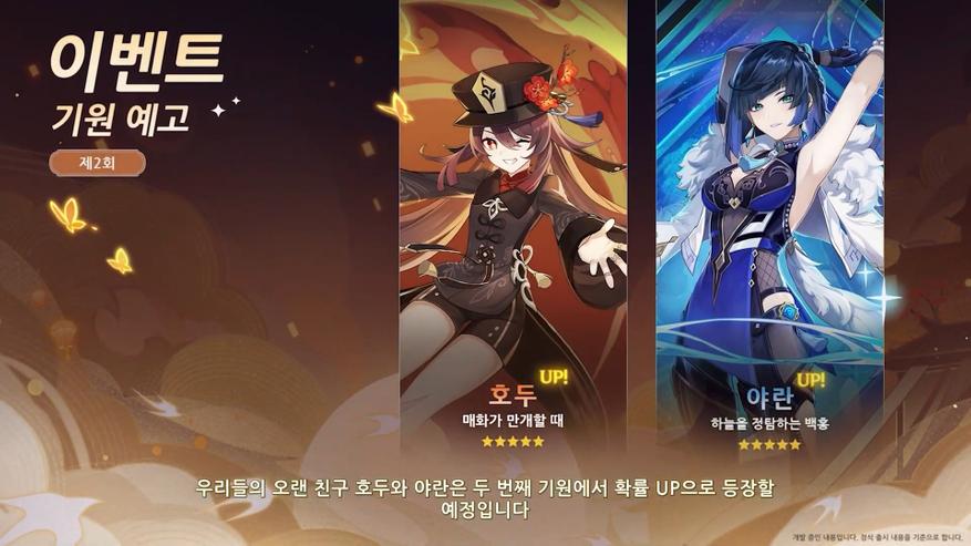 Во второй половине нас ожидает два рерана. Во-первых, спустя больше чем год, в игру возвращается Ху Тао. Она является пиро копейщицей и считается одним из (если не самым) дамажным героем в игре. Параллельно с ней будет запущен баннер Е Лань. Она у нас Гидро лучница и является легендарным аналогом такого персонажа как Син Цю, хоть и со своими особенностями.