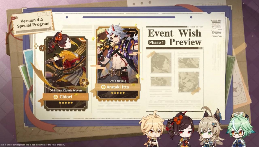 Новым легендарным персонажем патча 4.5 будет Тиори — она владеет Гео глазом бога и использует одноручный меч. Её баннер будет располагаться в первой половине обновления, а параллельно с ней в будет реран Аратаки Итто.