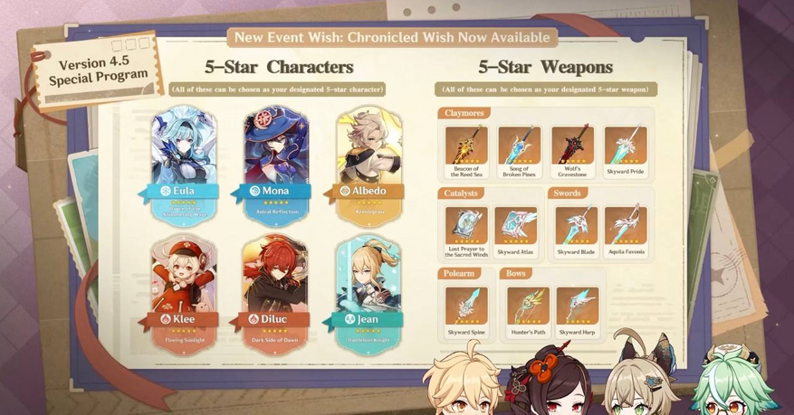 С обновлением 4.5 в игре появится новый баннер — региональный. Таким образом, в Мондштадсткий баннер войдут: Эола, Мона, Альбедо, Кли, Дилюк и Джин. А также их оружие. Предположительно, работать этот баннер будет по принципу оружейки — вы выбираете нужного героя и идёте к нему. Возможно, также, появится новый вид молитв. Сам баннер будет периодически обновляться меняя регион.