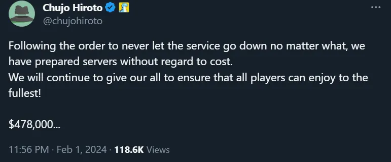 Сразу же после поста генерального директора, другой действующий сотрудник, Чуджо Хирото, уверил публику, что они могут не беспокоиться насчет отключения, так как у них есть запасной план, а именно, сервера без учета стоимости. Ну, а снизу поста Хирото оставил скрин с подписью.