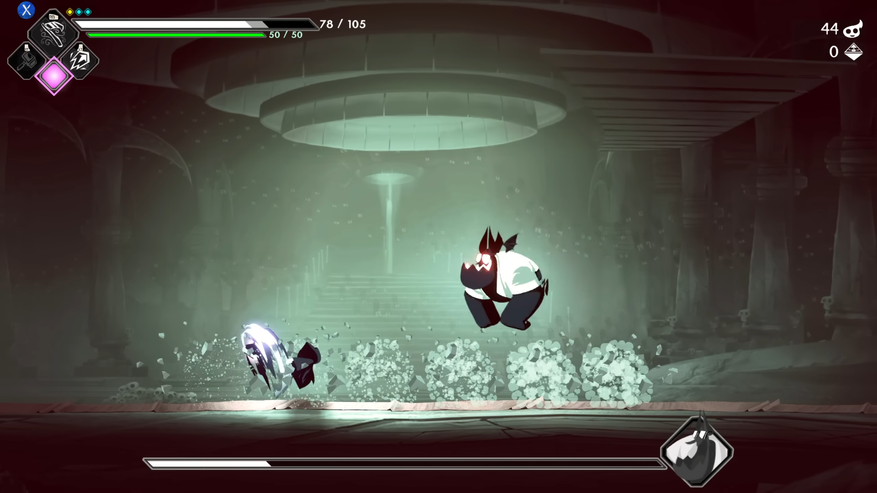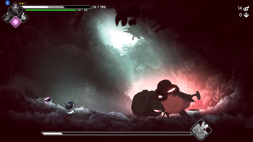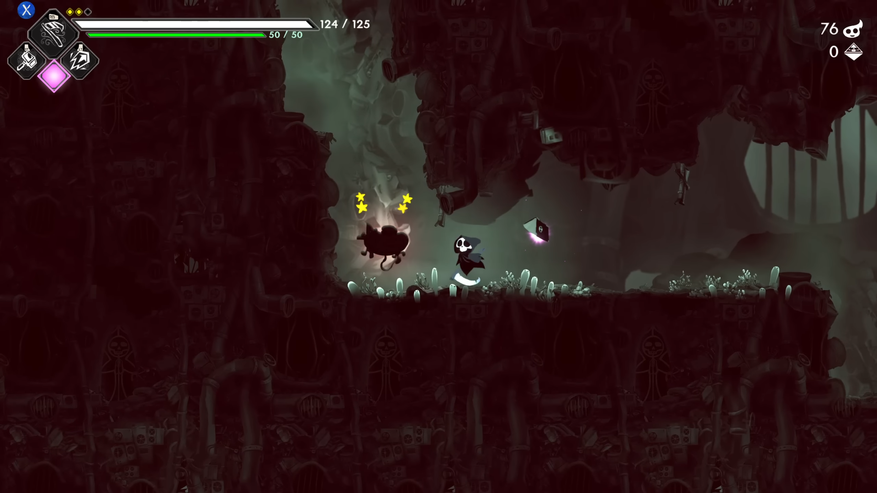 Боевка в игре тоже простая (наверное все уже заметили некую закономерность). Управление не требует каких-то особых умений, хоть на клавиатуре, хоть на геймпаде — бить и уклоняться всегда просто. Как и все рогалики, игра разделяется на «забеги», после каждой смерти (хотя Смерть тут не умирает, а «выгорает») мы начинаем новый забег, но уже чуть сильнее. В самом начале забега нам даётся только одно оружие, конечно же это коса. По ходу мы получаем различное дополнительное оружие, заклинания и «проклятия».