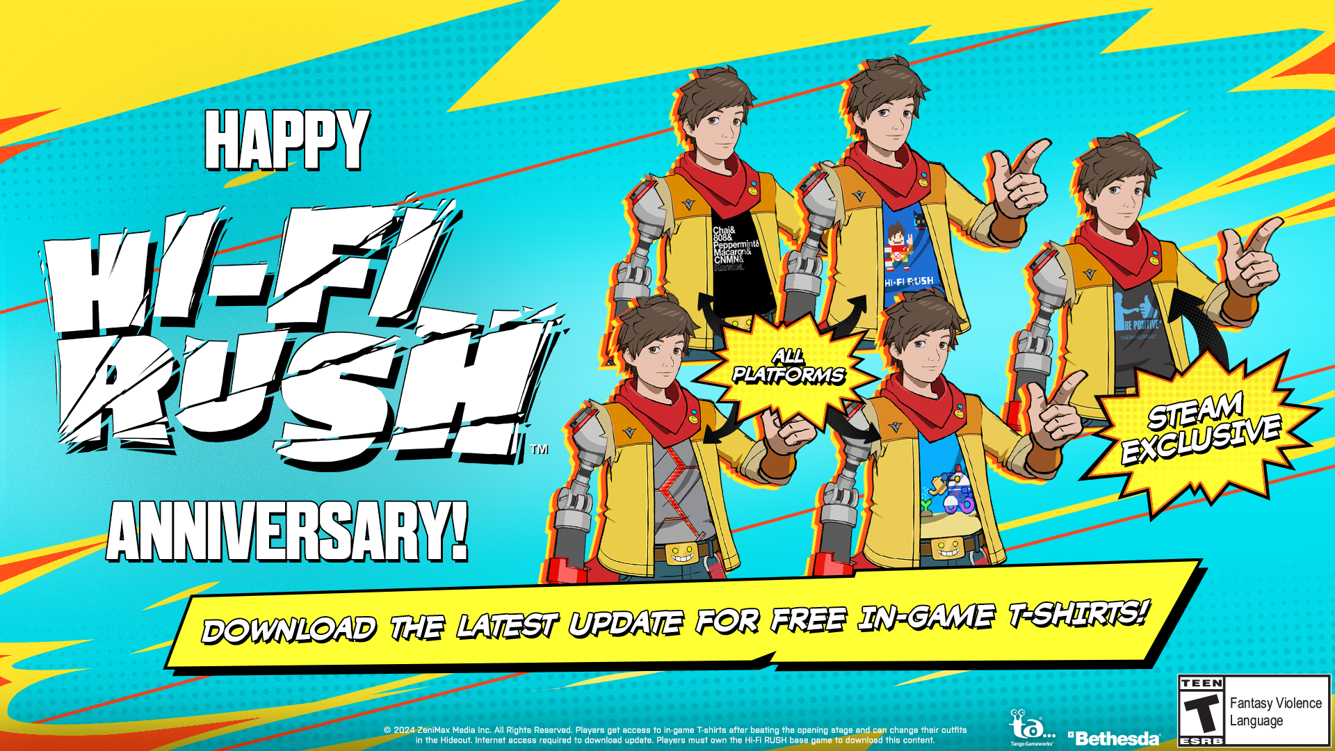 Tango Gameworks в честь годовщины выхода Hi-Fi Rush выпустила обновление для игры. Добавлены праздничные футболки для протагониста, а также по эксклюзивной футболке для каждой платформы.