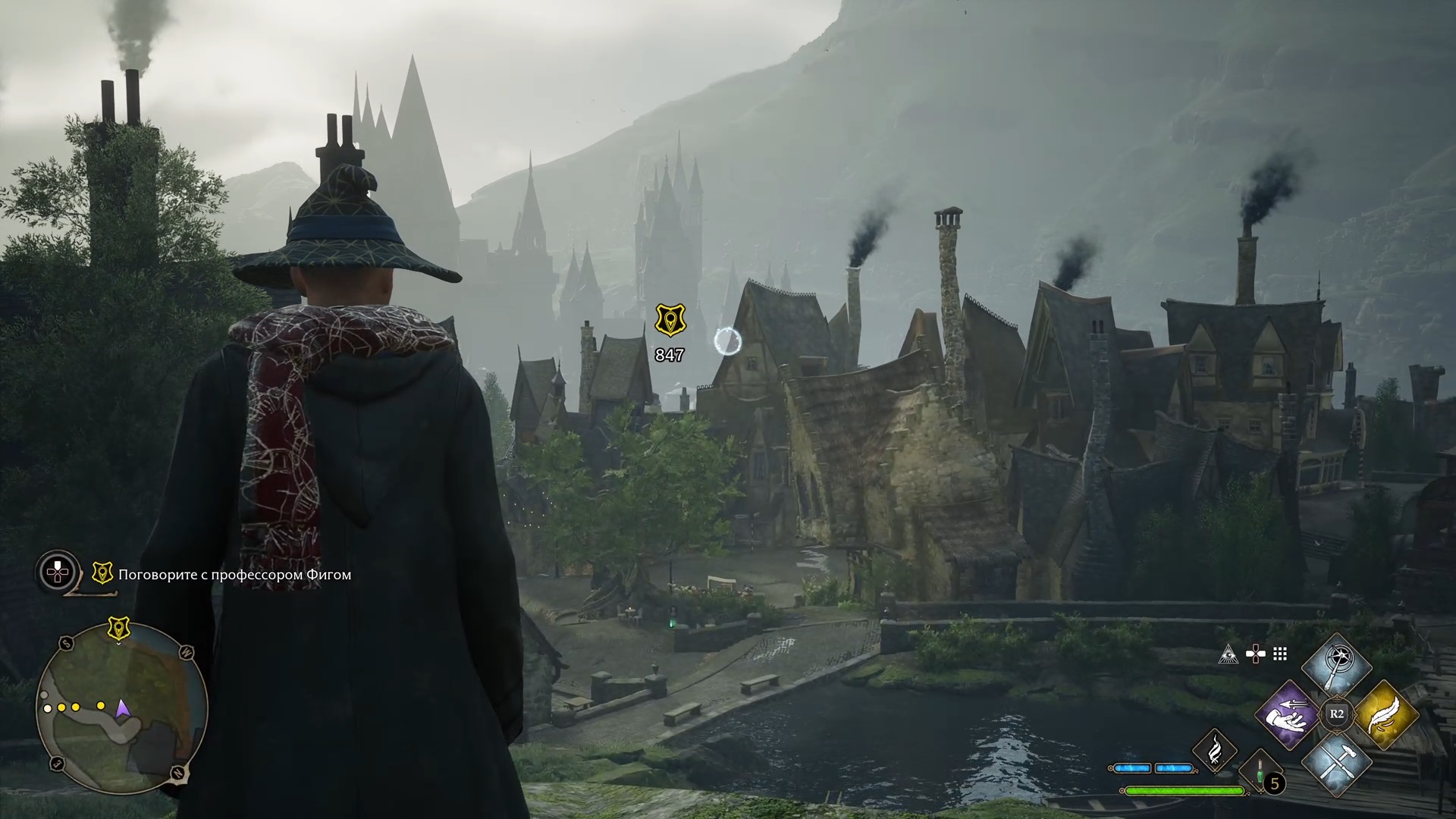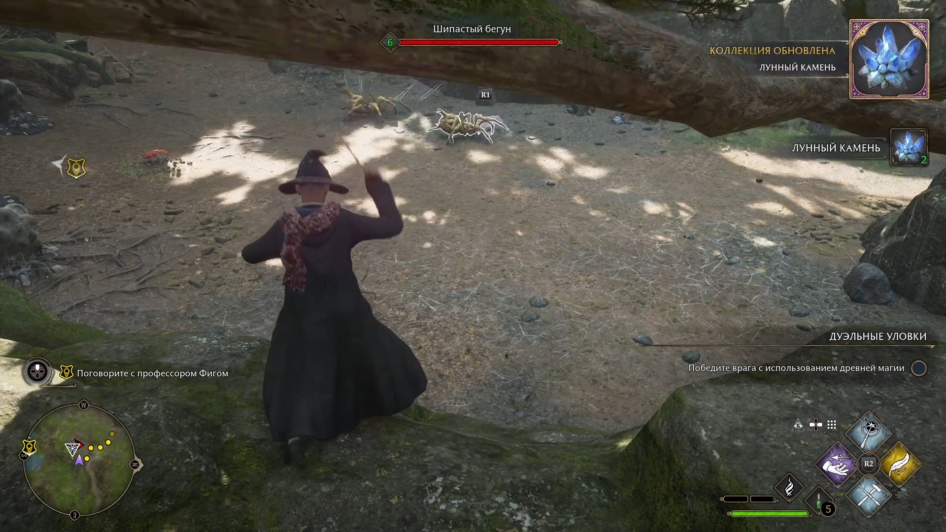 Но лично у меня возникло крайней спорное ощущение по отношению к управлению. Я играл на консоли, и сделать обычную атаку на R2, лично мне кажется не очень удобным решением. Опять же, всё чисто субъективно, но как есть. Дело в том, что на р2 так же поставлен и выбор навыков. И задержи ты палец на кнопке самую малость дольше, чем нужно, вместо того что бы стрелять базовым заклятьем, игра подумает что вы хотите выбрать навык. Из-за этого, в самом начале, во время туториала, вместо атаки и защиты я просто кастовал Люмос (свет на палочке, в бою бесполезно). И это бесит.