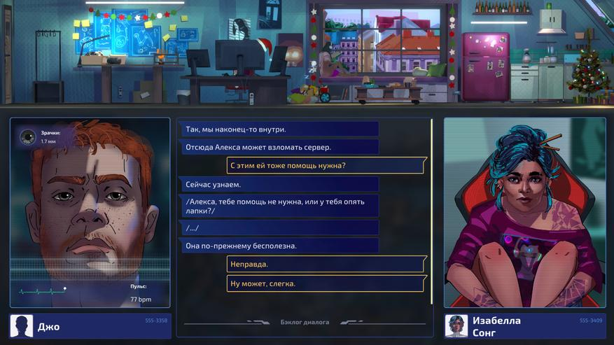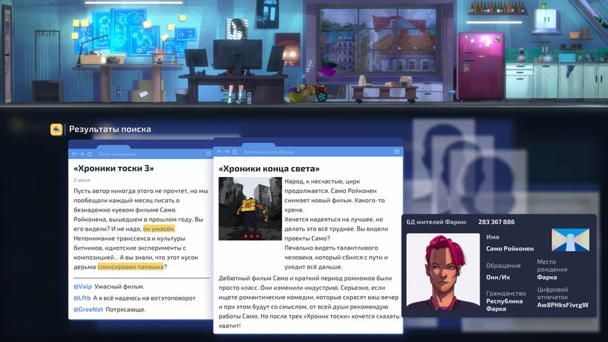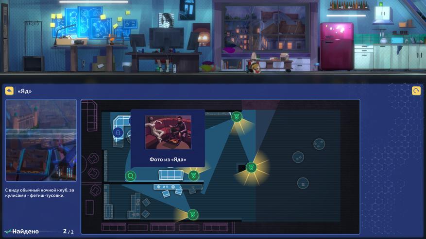 Первая особенность игры — разделение реального и виртуального мира: вверху мы следим за реальной жизнью Изи, а внизу взаимодействуем с виртуальной. Там мы общаемся с персонажами, собираем улики и строим аргументы, опираясь на ранее полученную информацию, через нажатие одной кнопки поиск массива данных в интернете.