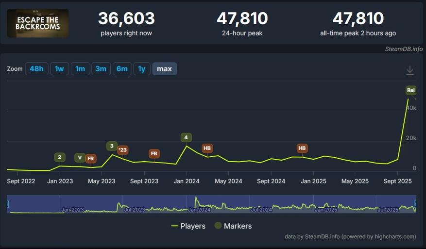 Вскоре после выхода обновления чарты Steam зафиксировали значительный рост активности: одновременно в Escape the Backrooms играло чуть менее 48 тысяч пользователей. Этот показатель стал рекордным за всё время. На данный момент игра продаётся со скидкой — её можно приобрести примерно за $7.
