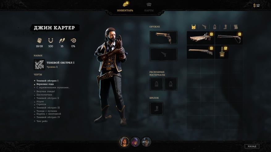 Начну с самих персонажей. У каждого из героев есть один уникальный активный навык и ряд пассивных навыков. Помимо навыков имеется ряд базовых характеристик: здоровье, удача (о ней позже), дальность (отвечает за предельную дистанцию перемещения), шанс меткого выстрела (крит). Если с активным навыком всё понятно, то пассивные навыки направлены на усиление героев и поощрение использования того или иногда вида оружия. Основная проблема в том, что этого просто мало и ближе к концу прохождения такой скудный набор, который в свою очередь безусловно даёт простор для тактики, уже успевает приестся и просто надоесть игроку.