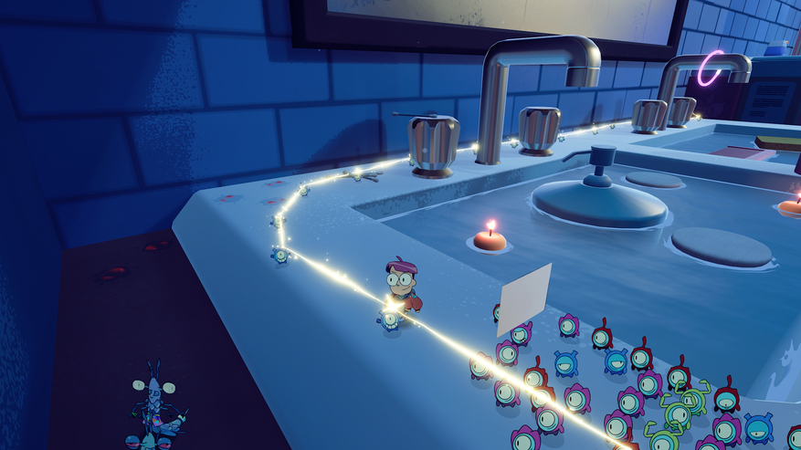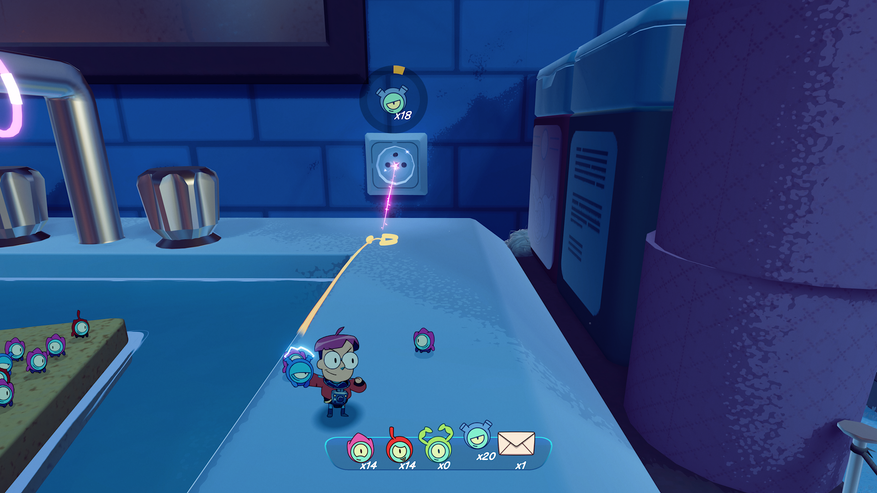 Начнём с главного героя. Он умеет ходить, скользить на мылборде(просто кусок мыла), прыгать и планировать в воздухе с помощью мыльного пузыря, свистеть(призыв тайникинов), кидать тайникинов. Вот и всё, что может главный герой. И тут может показаться, что будет скучно. Но не забывайте, что есть маленькие помощники, которые делают игру очень разнообразной.