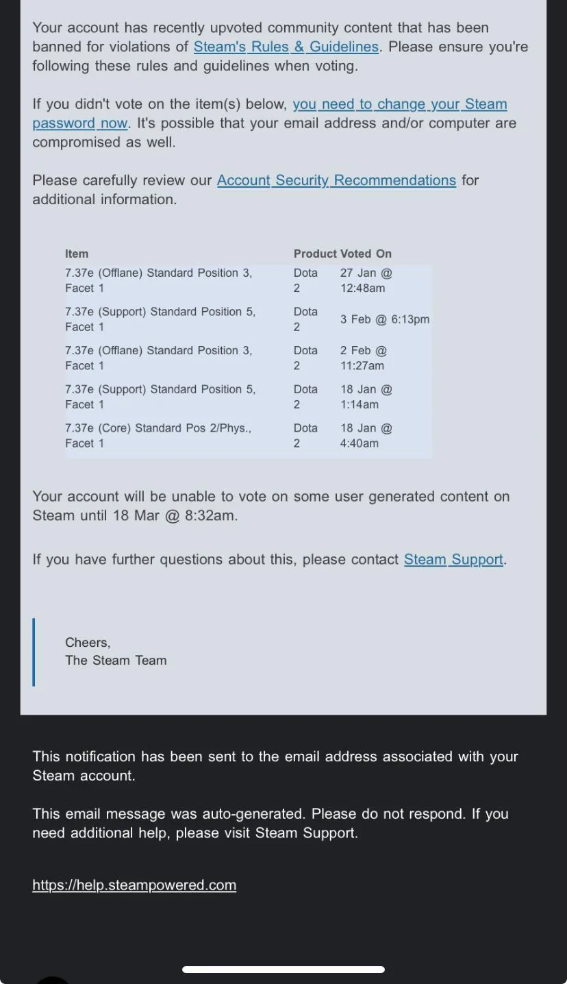 Недавно игроки в Dota 2 столкнулись с неожиданными банами своих профилей в Steam за то, что ставили лайки внутриигровым гайдам. Эта ситуация стала известна благодаря постам на Reddit, где пострадавшие пользователи делились своими взаимодействиями со службой поддержки Valve.