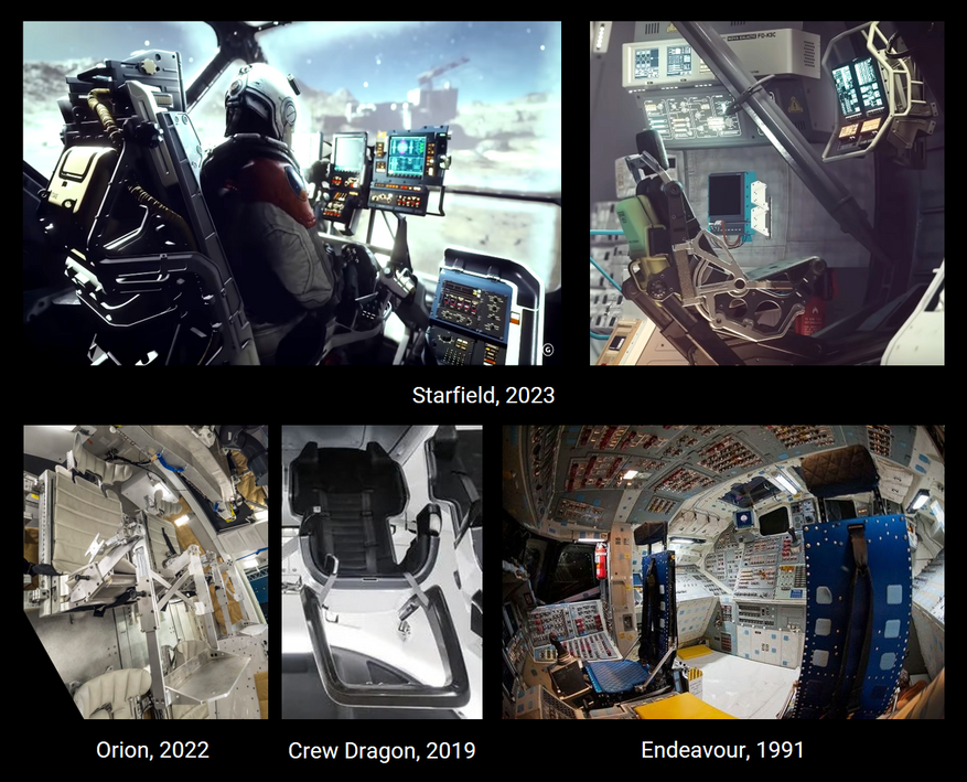 Ничего общего. Даже элементами, никаких заимствований нет. В современных космических кораблях кресло применяется в основном при взлете и посадке, а все остальное время астронавты работают в невесомости. NASA в этом вопросе придерживается минимализма в дизайне. Исключение здесь, корабли Илона Маска. Но и дизайн кресел в них не имеет ничего общего с Starfield.