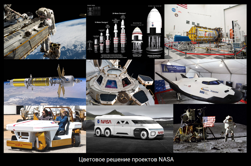 Все вышеописанные элементы формируют узнаваемую цветовую палитру NASA.