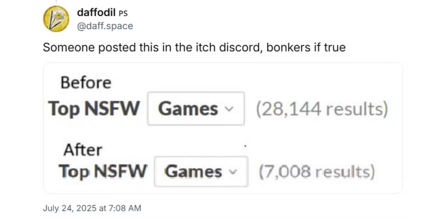 itch.io опубликовал на своем сайте заявление, подтверждающее, что игры, нарушающие новые правила, введенные теми же платежными системами, которые вынудили Steam принять меры на прошлой неделе, были «деиндексированы». Фактически это означает, что игры были удалены, но itch. io в настоящее время проверяет все деиндексированные игры и в ближайшее время опубликует новые меры по обеспечению соответствия новым правилам.
