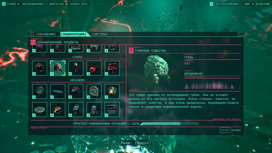 Ну и растения, что снова населили территории открывают проход к новым участкам безжизненного мира для продвижения по сюжету. Важно не забывать и об изучении открытых территорий, сканируя флору с фауной для заполнения энциклопедии, Рани получает новые возможности для улучшения руки-пылесоса и других устройств. Вся прокачка возможна только в хабе-звездолёте, который служащий базой, куда можно вернуться через навигационные маячки — точки быстрого перемещения.