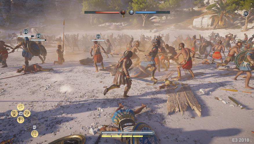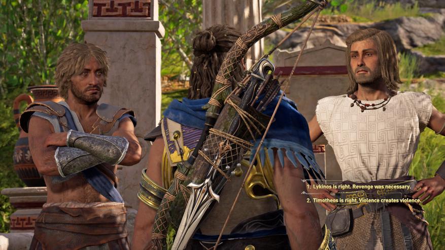 В остальном — всё очень плохо. Полезна ветка прокачки стэлса постольку-поскольку. Наш наёмник не может даже большую часть противников с одного удара убить. Выглядит это так: воткнув копьё в зад врага, протагонист смотрит на него. Тот смотрит в ответ, затем через «разум роя» передаёт всем в округе, что он заметил нарушителя, и начинается драка, с участием всего лагеря/акрополя/дома предводителя/даже Зевса.