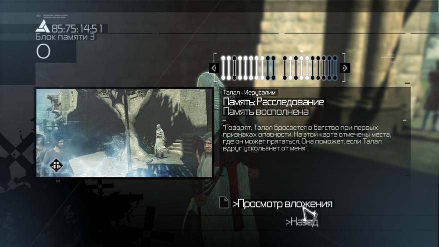 Всё вступление дотошно объясняется, каждая деталь, каждая мелочь – сценаристы постарались сделать так, чтобы у вас не было никаких вопросов. Здесь и введение в азы понятия «памяти», полная техническая характеристика и описание работы машины Абстерго. Даже в обучении нам помогает голосовой помощник, который объясняет все геймплейные моменты как управление марионеткой внутри Анимуса, ведь мы не живём жизнью предка, а просто как бы «следим» за событиями.