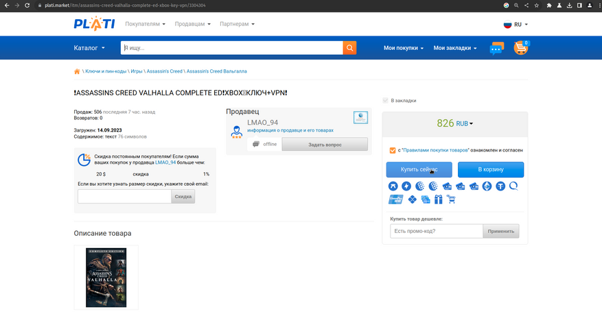 1. Переходим на веб-сайт торговой площадки Plati. В отличие от жуликов, которые в последнее время заполонили рунет поддельными онлайн-магазинами по продаже ключей активации игр, ресурс Plati является проверенной годами торговой площадкой, где тысячи сертифицированных продавцов предлагают свои товары. Не говоря уже о действующей трехдневной защите покупателя, системы отзывов и круглосуточной службы онлайн поддержки.