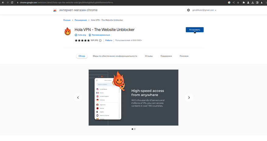 1. Устанавливаем для веб-браузера (Chrome) популярное проверенное расширение Hola VPN.