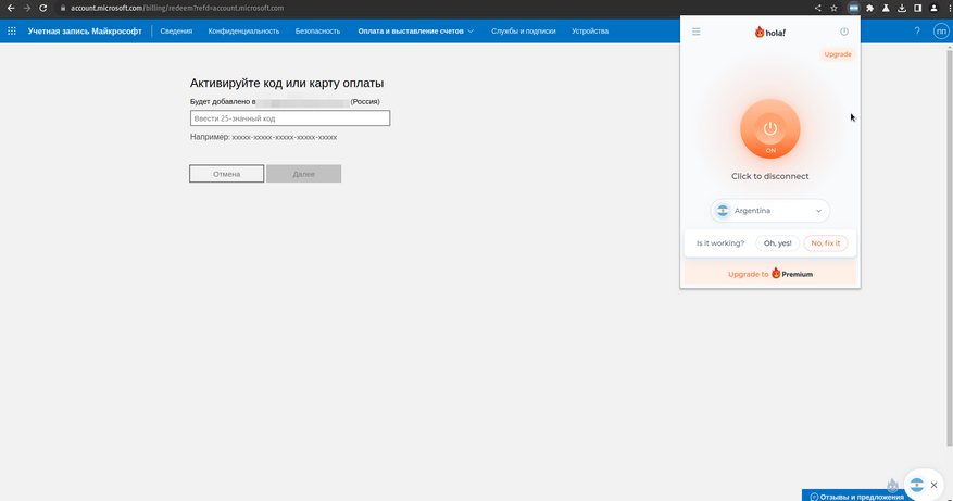 2. На веб-странице Microsoft через Hola VPN выбираем страну Аргентину или ту, которая указана у продавца ключа в описании товара.