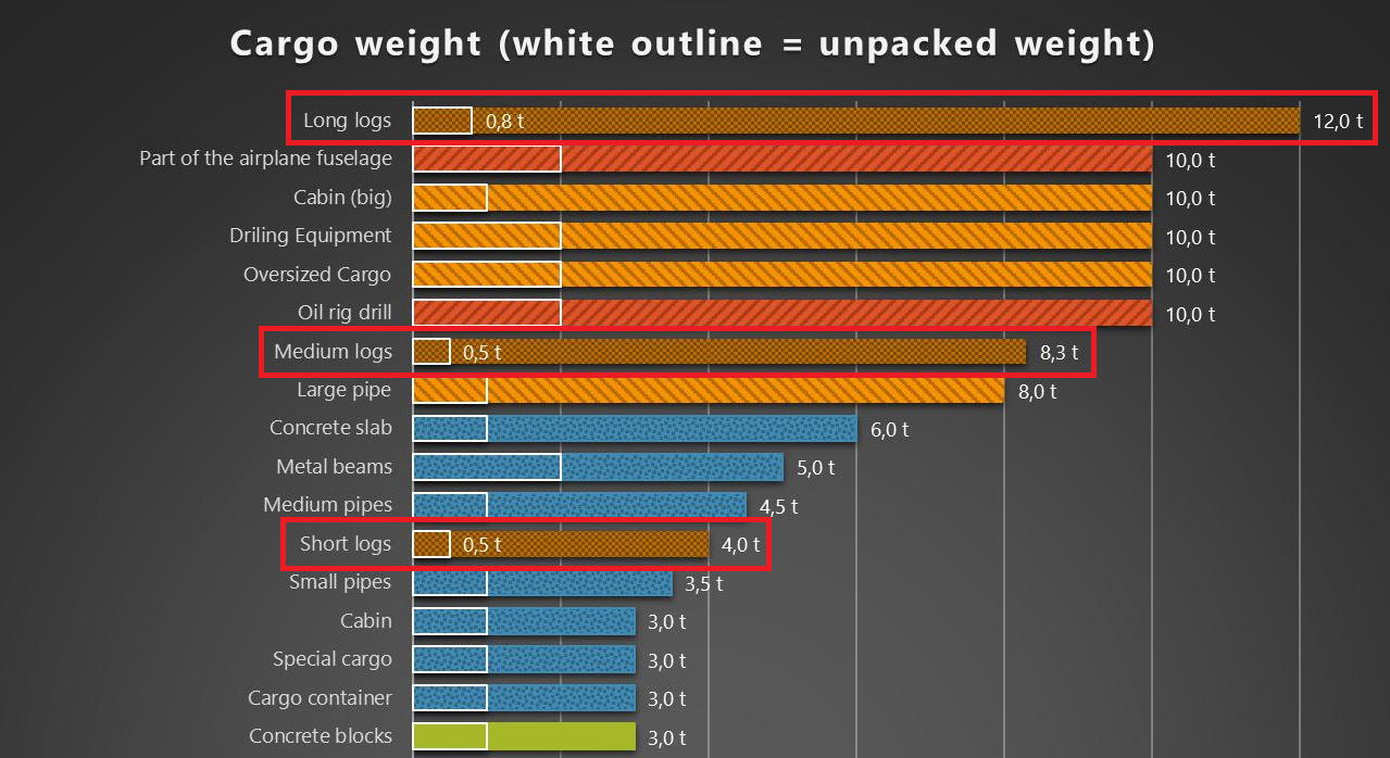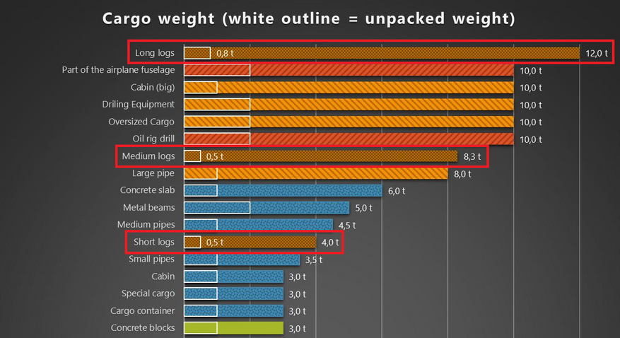 Длинные брёвна также встречаются во всех регионах, но они значительно тяжелее в запакованном виде: 12 тонн для длинных против 8,3 тонны для средних брёвен. Вес груза во многом диктует выбор подходящего грузовика для такой задачи — на слишком слабом не увезёшь.