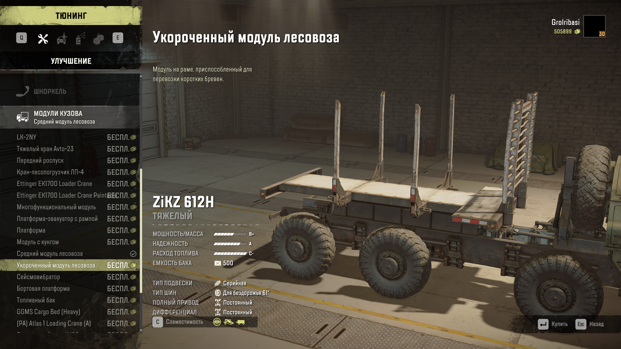 Вот, например, для средних брёвен есть возможность перевозить их на раме грузовика и/или в прицепе. Модуль для перевозки средних брёвен ставится в гараже. Читайте описание внимательно! В модуль для средних не получится загрузить короткие, обратное тоже верно. Некоторые грузовики после установки модуля способны также возить прицеп, но таскать ещё и прицеп — не лучшая затея. Во-первых, как сказано выше, брёвна — один из самых тяжёлых грузов, а тяжелее одной пачки такого груза может быть только одна пачка в модуле и вторая пачка на прицепе. Не каждый грузовик способен вытянуть такую тяжесть. Но брать слишком тяжёлый транспорт и чрезмерно упрощать себе геймплей тоже не хочется. Так и получается, что самым правильным решением будет погрузка брёвен исключительно в модуль для них, тогда и прицеп не придётся покупать/продавать. Грузить брёвна только на грузовик полезно ещё и тем, что в случае опрокидывания придётся меньше собирать.