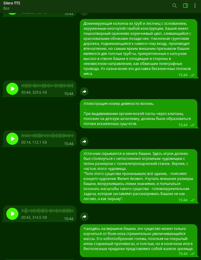 На сегодняшний день бурно развиваются нейросети, которые уже многое могут — отвечать развернуто на вопросы, рисовать картины по словесному описанию, а также генерировать голос по тексту. Именно нейросетевой генерацией голоса я и решил воспользоваться. Программа выполнена в виде телеграм-бота. Заходим в него, выбираем требуемый голос из десятков вариантов и «скармливаем» боту свой текст. В ответ бот присылает озвученные аудиофайлы. Вот так выглядит процесс озвучивания в телеграмме — посылаете боту кусочек текста, в ответ бот присылает звуковой файл. Все просто. Таким образом озвучиванием можно заниматься даже в телефоне.