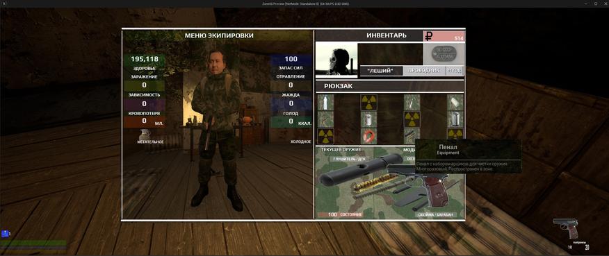 Еда восстанавливает запас сил. Вода восстанавливает эффектор жажды. С жаждой герой не сможет бегать. Голодный бегать сможет, но запас сил у него будет сокращенным. Если игрок долго не ест, то он «худеет». У него сокращается запас сил и жизненная сила. Также протагонист может отравиться газом или кислотными испарениями. Отравление является временным эффектом которое тоже сокращает запас сил. Чтобы его избежать надо будет надевать противогаз. При серьезных ранениях открывается кровотечение, котороен адо останавливать специальными лекарственными средствами. Но размер рюкзака ограничен, от чего-то придется отказаться. На данный момент реализовано 67 предметов инвентаря.